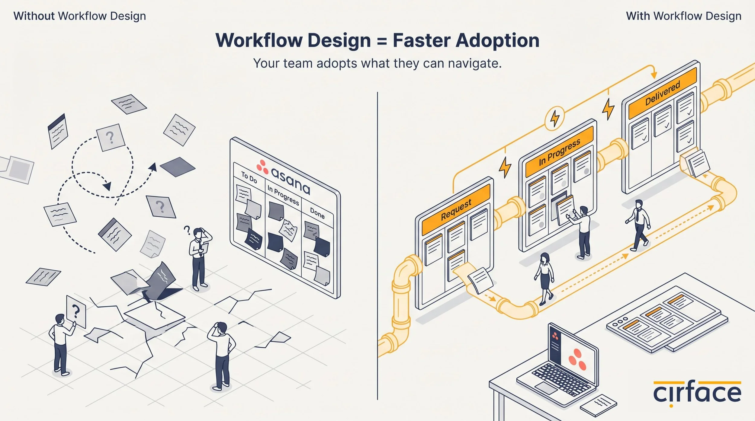 | Workflow design | Operational structure | How work actually moves through Asana | The team learns a broken or confusing system |